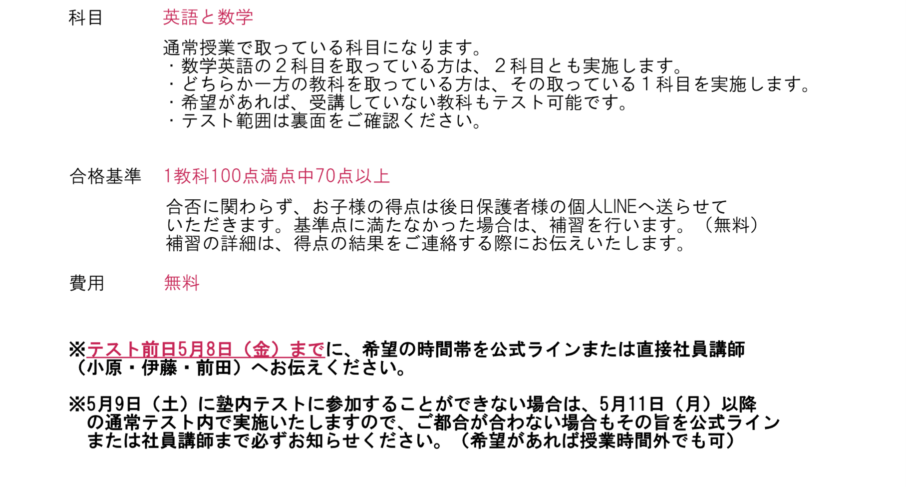 ゴールデンウィーク期間・塾内テスト・ご請求書のお渡しについて