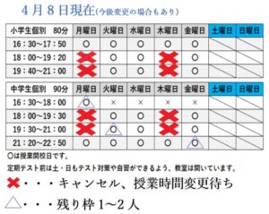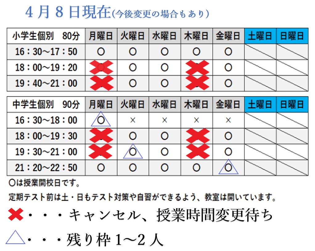 2021年4月8日 / 最終更新日 : 2021年4月8日 obara 4月8日現在の空き枠 FacebooktwitterHatena コメントを残す コメントをキャンセルメールアドレスが公開されることはありません。 * が付いている欄は必須項目ですコメント 名前 * メール * サイト 次回のコメントで使用するためブラウザーに自分の名前、メールアドレス、サイトを保存する。