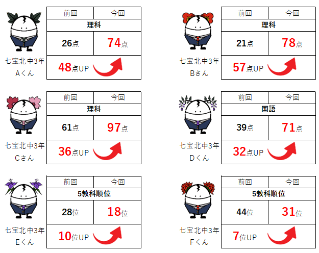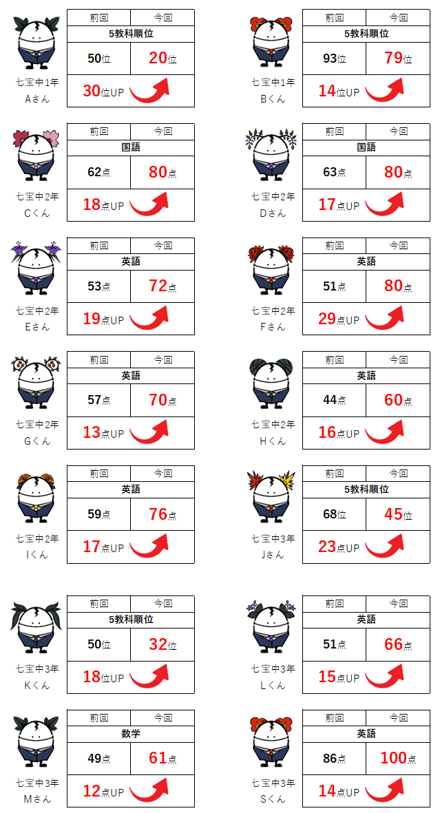 冬期講習会に参加後に入塾した七宝中1年生3人の全員が、過去最高順位を更新!