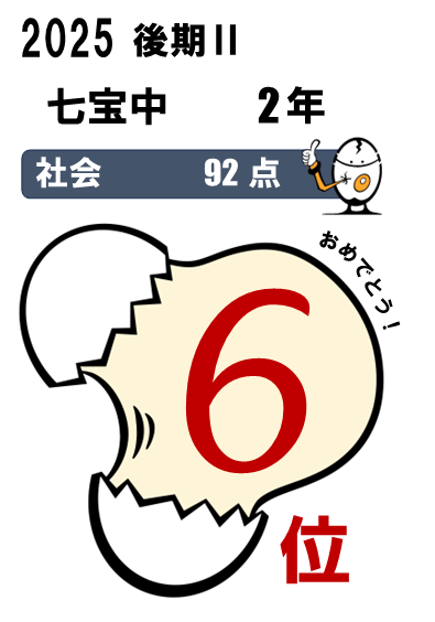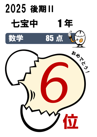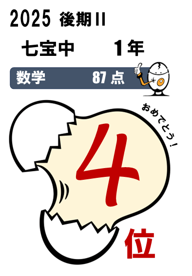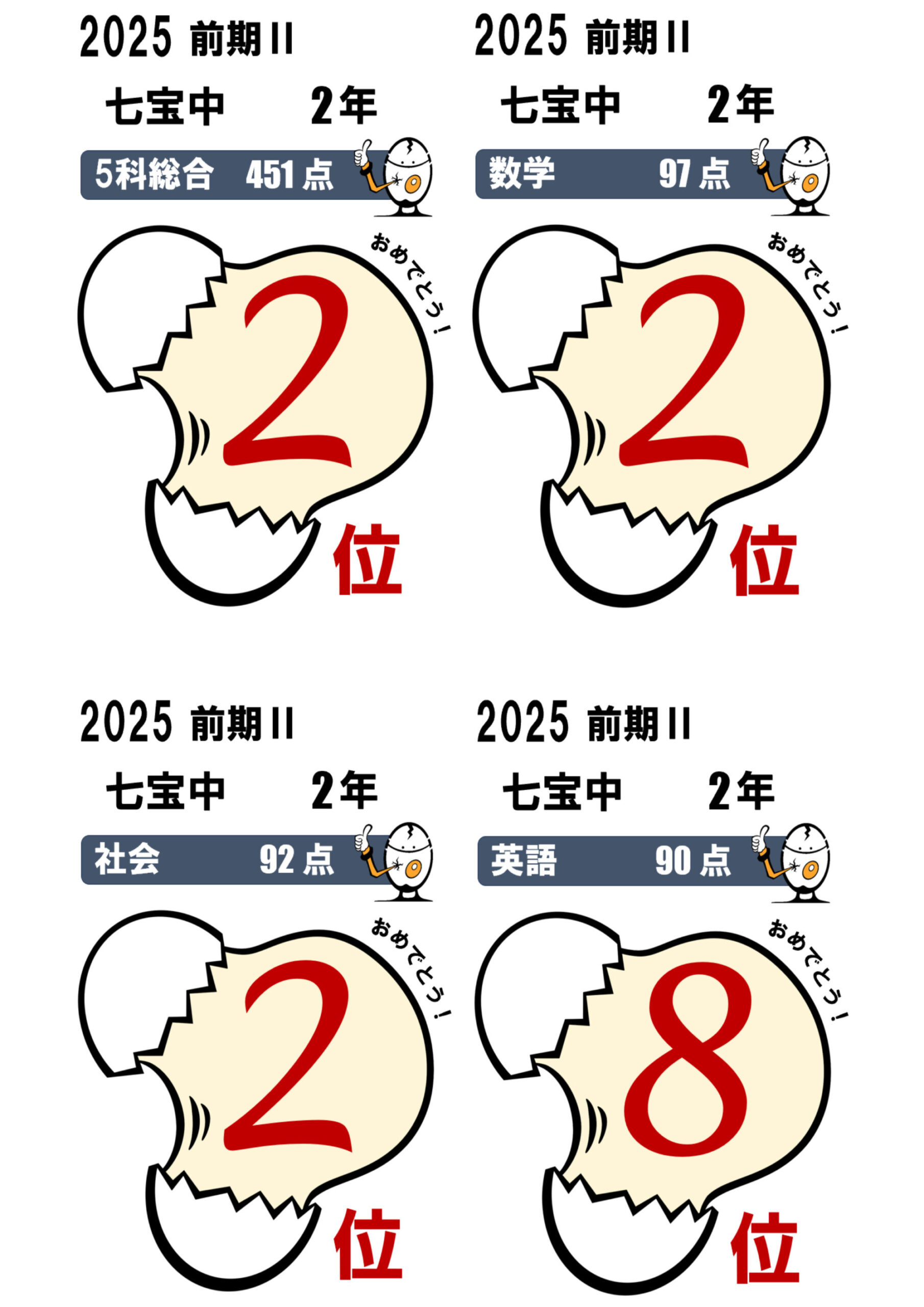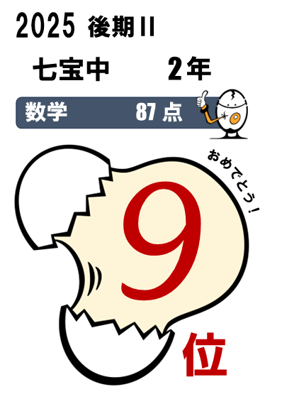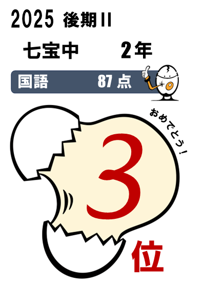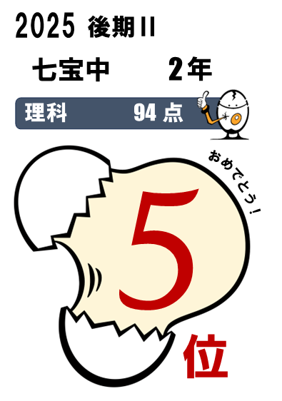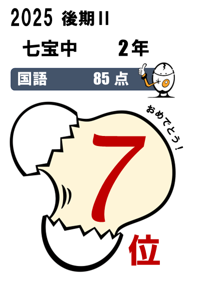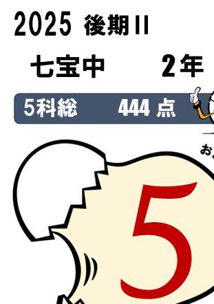 七宝中2年・・・5科総合3位(464点)、国語1位(90点)、5科総合入塾時90位⇨今回25位など