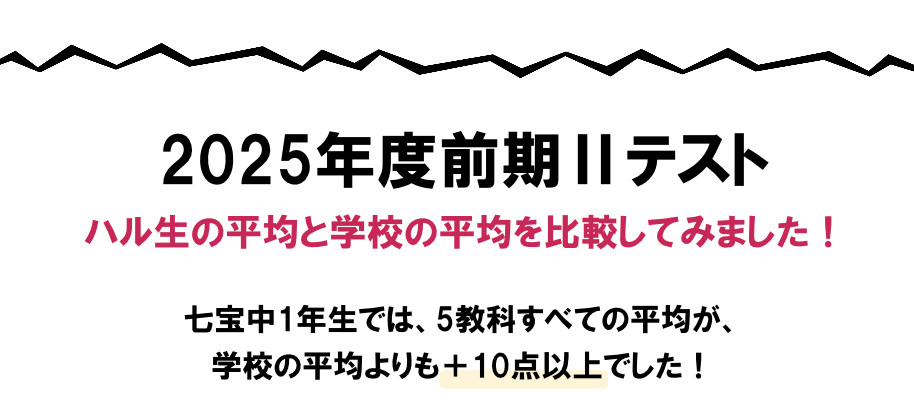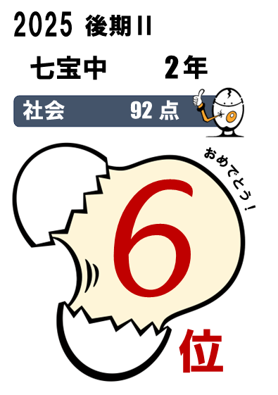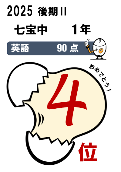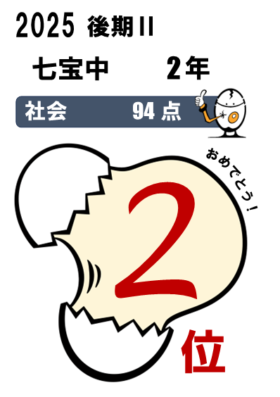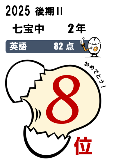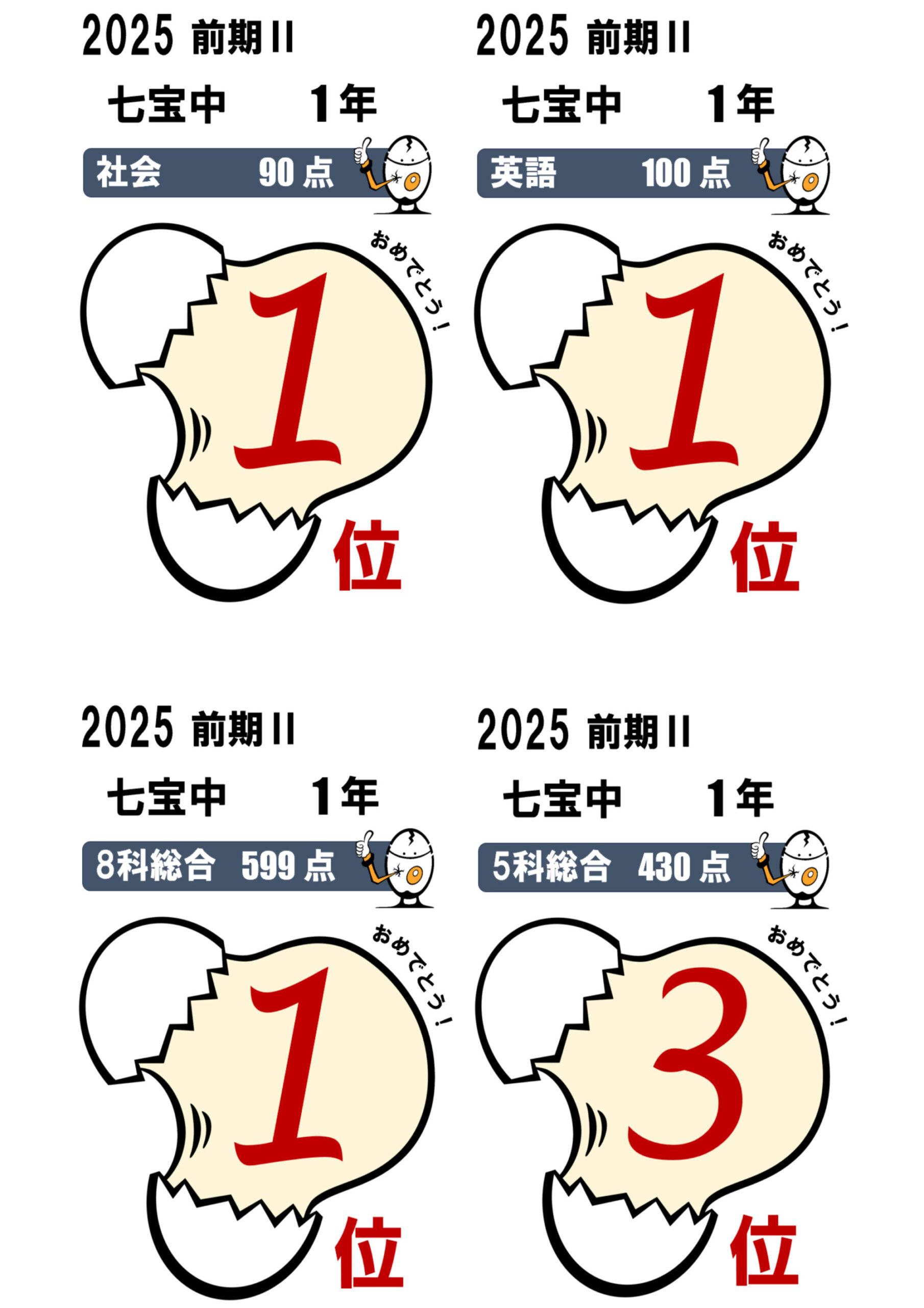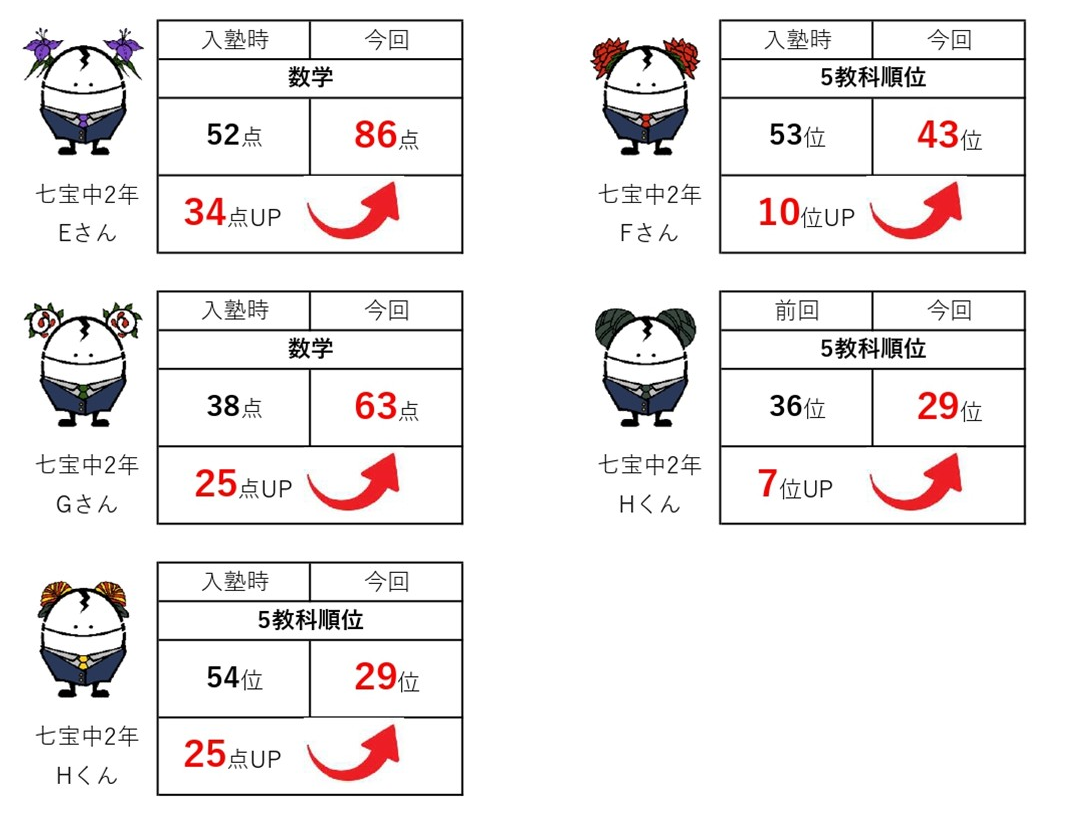 七宝中2年・・・5科総合3位(464点)、国語1位(90点)、5科総合入塾時90位⇨今回25位など