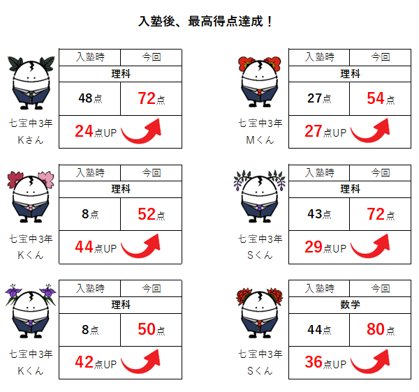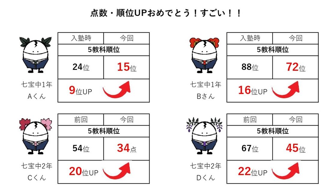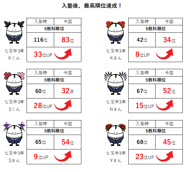 冬期講習会に参加後に入塾した七宝中1年生3人の全員が、過去最高順位を更新!